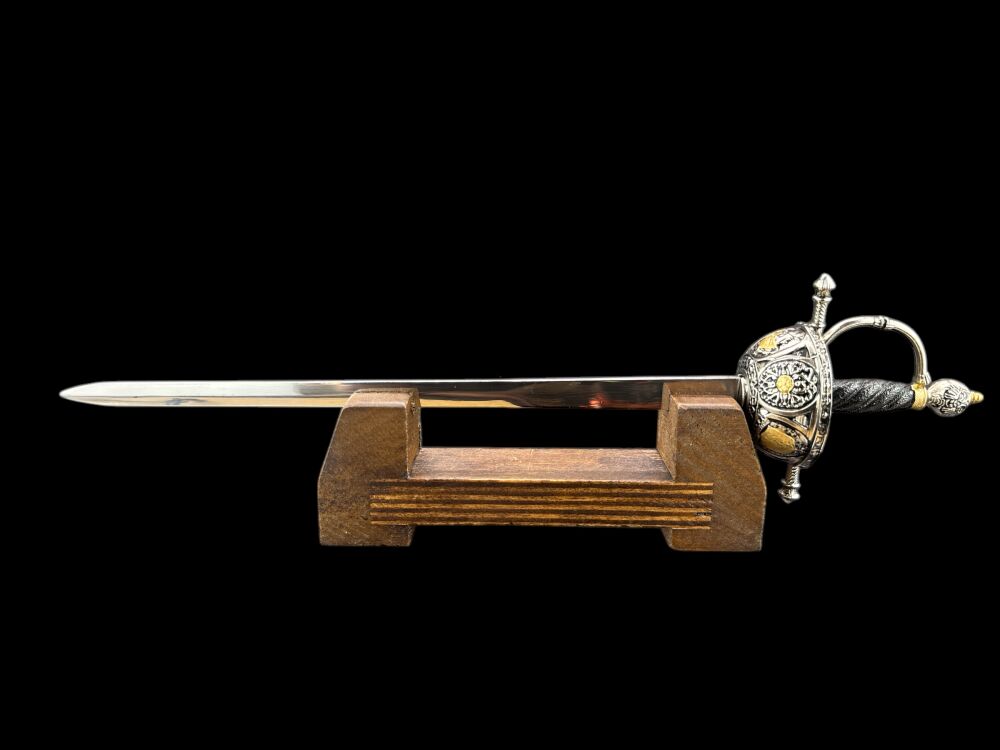 ❇️Każdy element tego wyjątkowego małego miecza został wykonany z niezwykłą precyzją i dbałością o detale. Ostrze ze stali nierdzewnej gładkie obustronnie. Rękojeść, wykonana z metalu, jest nie tylko piękna, ale i wygodna w dotyku. Bogato zdobiony kosz dzwonowy dodaje całości majestatycznego wyglądu, czyniąc go prawdziwym dziełem sztuki rzemieślniczej.