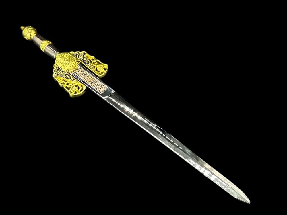 ❇️Każdy element tego wyjątkowego małego miecza został wykonany z niezwykłą precyzją i dbałością o detale. Ostrze ze stali nierdzewnej zdobione jest obustronnie, prezentując bogate grawerunki związane z historią i tradycją. Rękojeść, wykonana z metalu, jest nie tylko piękna, ale i wygodna w dotyku. Bogato zdobiona głowica i jelec dodają całości majestatycznego wyglądu, czyniąc go prawdziwym dziełem sztuki rzemieślniczej.