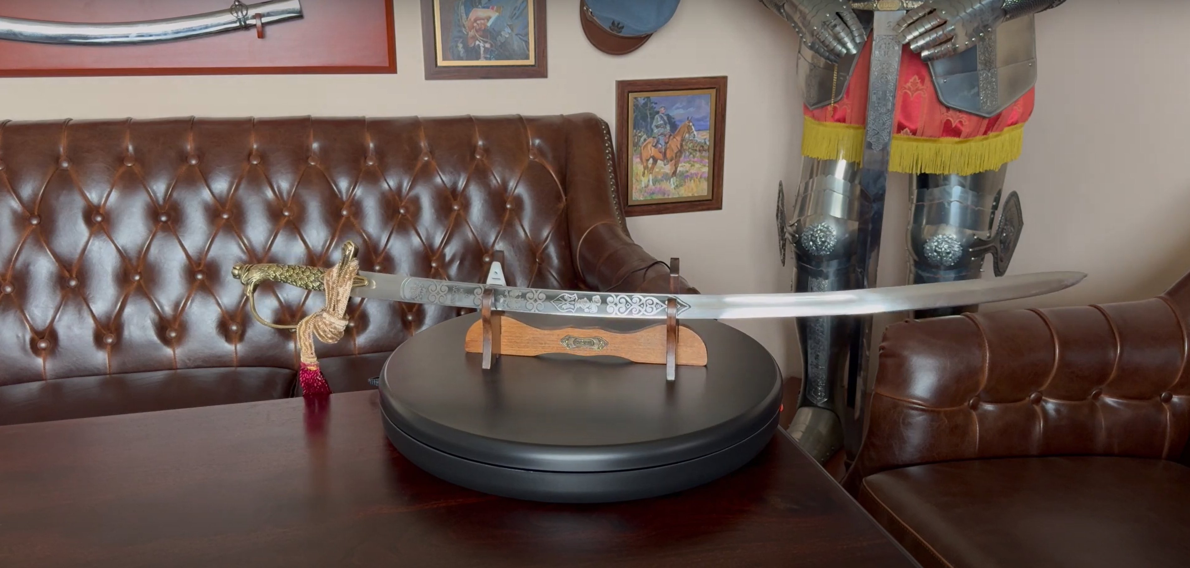 W zestawie z szablą znajduje sie drewniane tablo na broń.