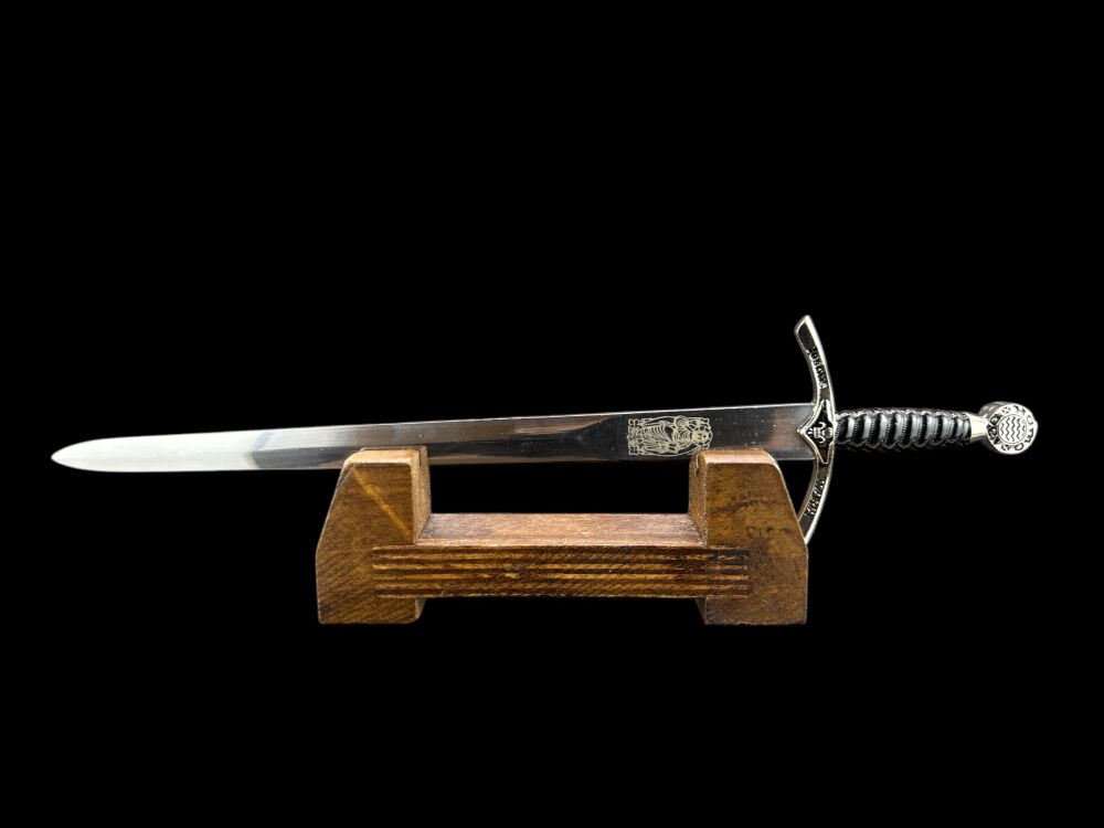 ❇️Każdy element tego wyjątkowego małego miecza został wykonany z niezwykłą precyzją i dbałością o detale. Ostrze ze stali nierdzewnej zdobione jest obustronnie, prezentując bogate grawerunki związane z historią i tradycją. Rękojeść, wykonana z metalu, jest nie tylko piękna, ale i wygodna w dotyku. Bogato zdobiona głowica i jelec dodają całości majestatycznego wyglądu, czyniąc go prawdziwym dziełem sztuki rzemieślniczej.