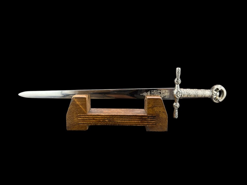 NOŻYK DO LISTÓW MINIATURKA HISTORYCZNY MIECZ KRZYŻOWCÓW ZE STALI TOLEDAŃSKIEJ (12)plus stojak